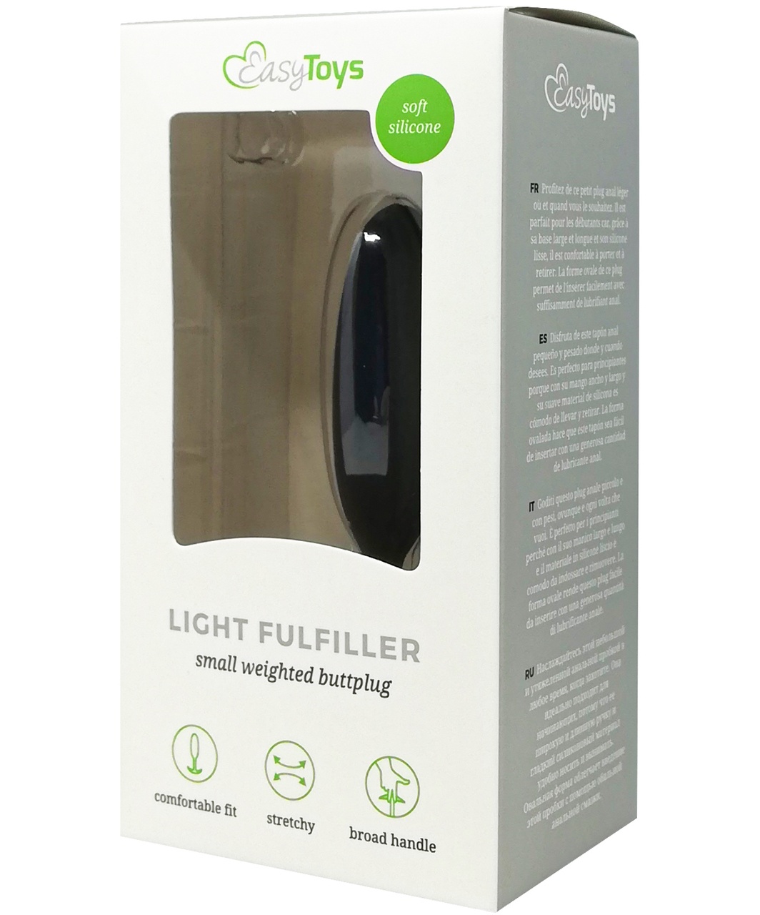 Black firm oval-shaped weighted butt plug. Made of silky-smooth material, with skinny and flexible base.