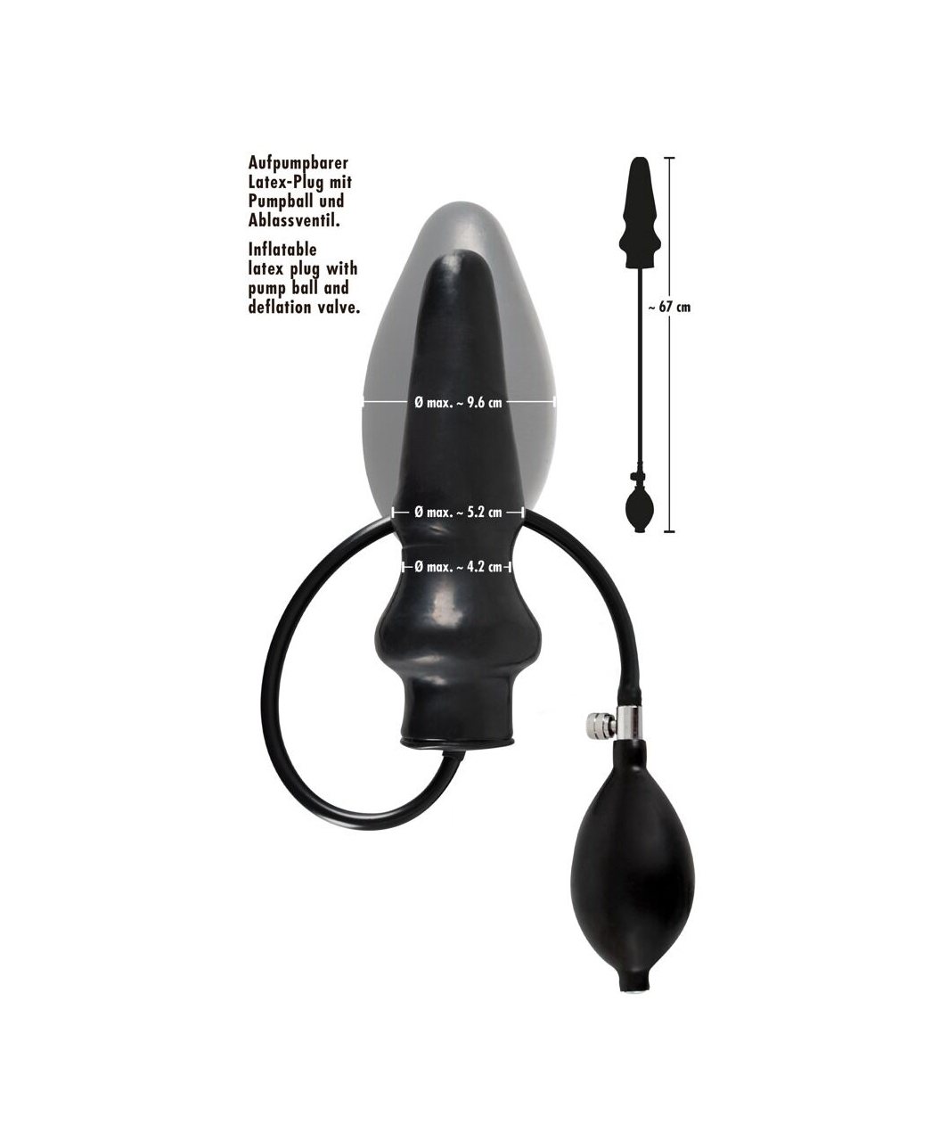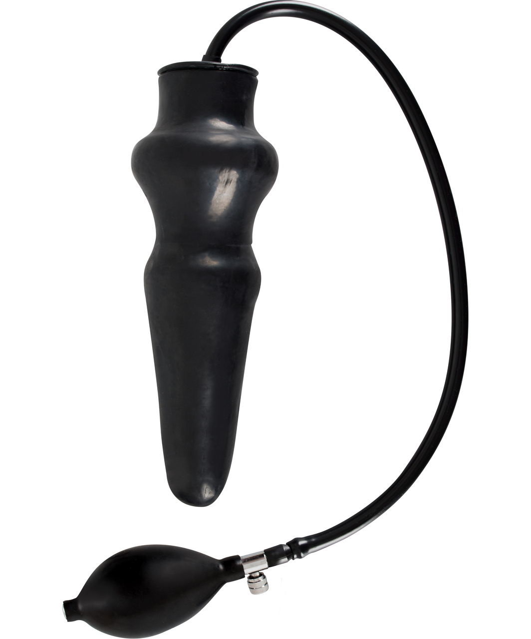 Черный, латексный, надувной анальный стимулятор. Он сделан в виде конуса с расширением внизу, чтобы заботится о безопасности и имеет ручку для более удобного использования. Ядро стимулятора твердое, а в надутом состоянии оно становится мягким.