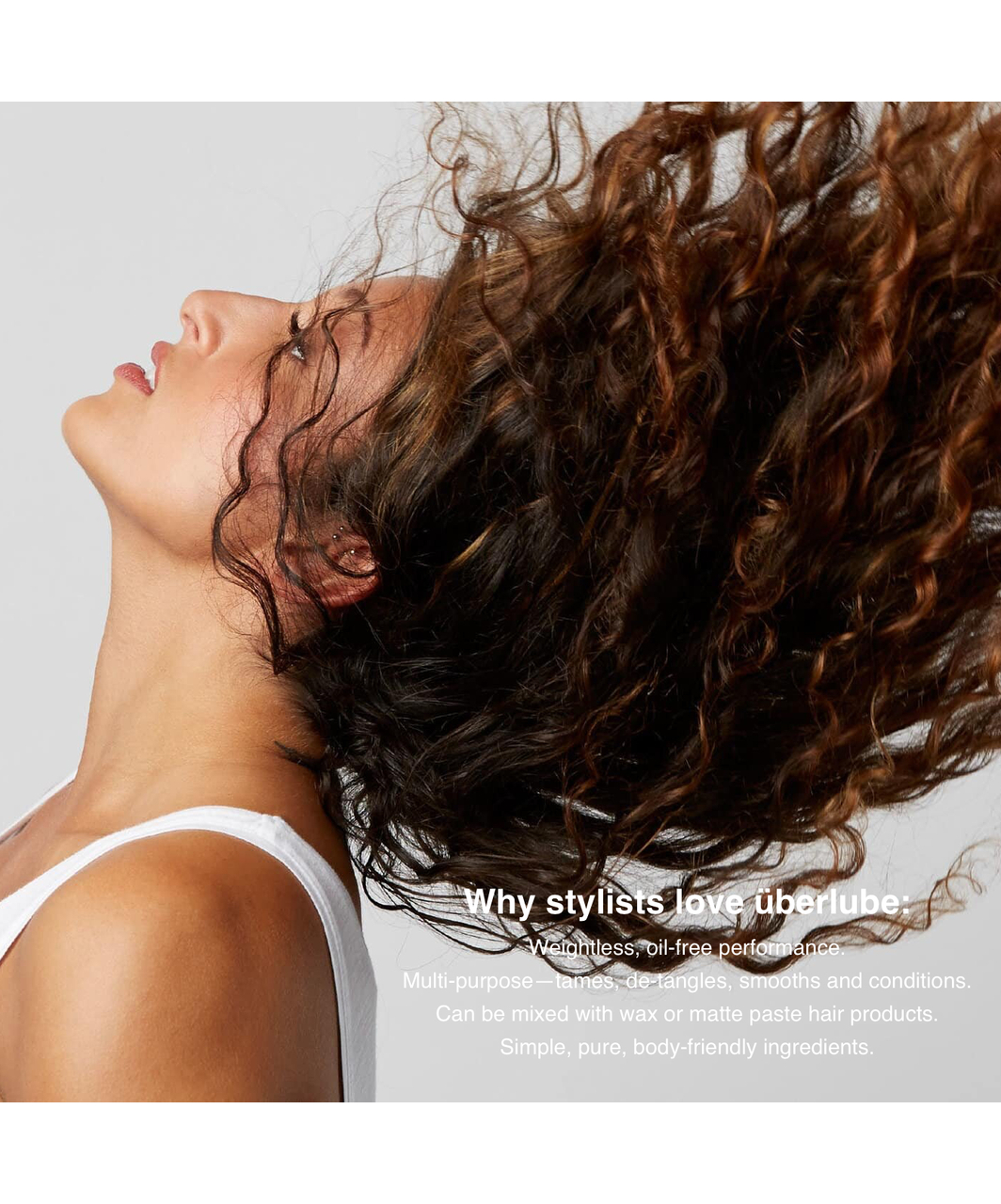 Überlube можно наносить перед сушкой феном для термозащиты или после укладки для защиты от пушистости. Überlube - многоцелевое решение для укладки волос в салоне и дома: от укрощения пушения и кондиционирования кончиков до придания гладкости и здорового блеска.